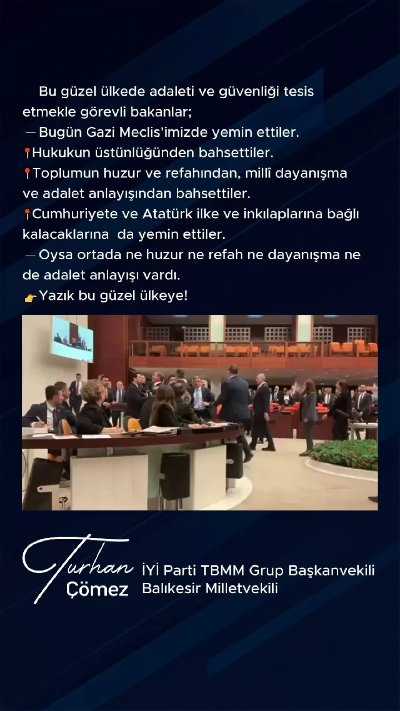 Ancak milletvekili, bu söylemlerin pratikte bir karşılığı olmadığını iddia etti. Çömez, "Oysa ortada ne huzur ne refah ne dayanışma ne de adalet anlayışı vardı" ifadelerini kullanarak, yönetim anlayışını eleştirdi. Açıklamasını "Yazık bu güzel ülkeye!" sözleriyle tamamlayan Çömez, sert tepkisini dile getirdi.