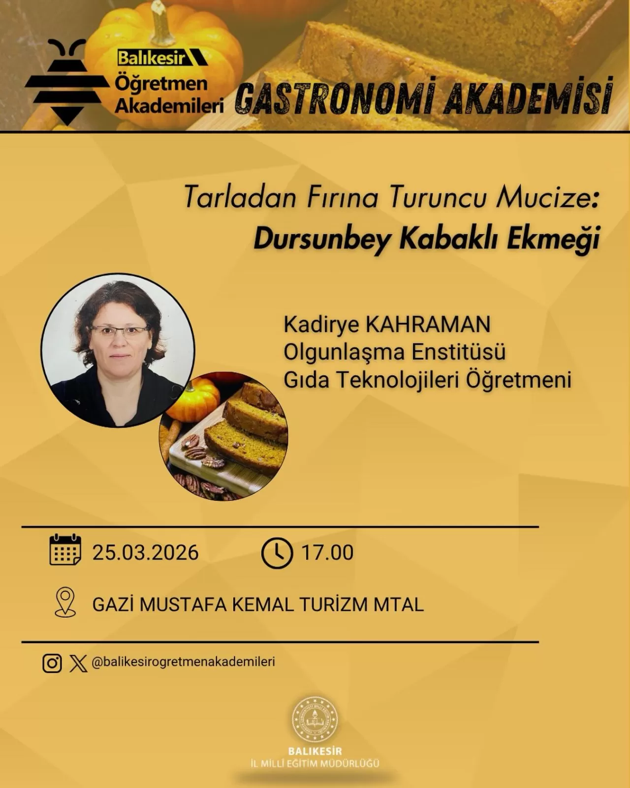 İran'dan Türkiye'ye Doğalgaz Akışı Durduruldu**Balıkesir Öğretmen Akademileri, Gastronomi ile Kültürü Buluşturdu** Balıkesir İl Milli Eğitim Müdürlüğü bünyesinde faaliyet gösteren Balıkesir Öğretmen Akademileri, eğitimcilere yönelik benzersiz bir etkinliğe imza attı. Akademiler kapsamında yeni kurulan Gastronomi Akademisi'nin ilk etkinliği olan "Dursunbey Kabaklı Ekmeği Yapımı" atölyesi, öğretmenler ve konuya ilgi duyan katılımcılarla buluştu. **Kültürel Mirasın Eğitimdeki Yeri** Etkinlik, öğretmenlerin mesleki gelişiminin yanı sıra, yöresel değerlerin ve somut olmayan kültürel mirasın eğitim yoluyla aktarılmasına odaklandı. Balıkesir'in Dursunbey ilçesine özgü bir lezzet olan Kabaklı Ekmeğin yapım sırlarının öğretilmesi, bu mirasın gelecek nesillere taşınmasında eğitimcilerin rolünü güçlendirmeyi amaçladı. **Atölyenin Pratik Detayları** Uygulamalı atölye çalışması, 25 Mart 2026 Çarşamba günü saat 17:00'de, Balıkesir'in Karesi ilçesindeki Gazi Mustafa Kemal Turizm Meslek Teknik Anadolu Lisesi'nde gerçekleştirildi. Etkinliğin eğitmenliğini, konunun uzmanı Kadirye Kahraman üstlendi. Katılımcılar, geleneksel bir tarif olan Dursunbey Kabaklı Ekmeği'nin hamurundan pişirilmesine kadar tüm aşamalarını birebir uygulayarak öğrenme fırsatı buldu. **Öğretmen Akademilerinin Amacı** Balıkesir Öğretmen Akademileri, öğretmenlerin kişisel ve mesleki becerilerini geliştirmek, onları farklı disiplinlerle tanıştırmak ve yenilikçi eğitim yaklaşımlarını desteklemek için çeşitli programlar düzenliyor. Gastronomi Akademisi de bu kapsamda hayata geçirilen yeni bir dal oldu. Bu tür etkinliklerle, öğretmenlerin sınıf içi deneyimlerini zenginleştirmek ve kültürel farkındalığı artırmak hedefleniyor.