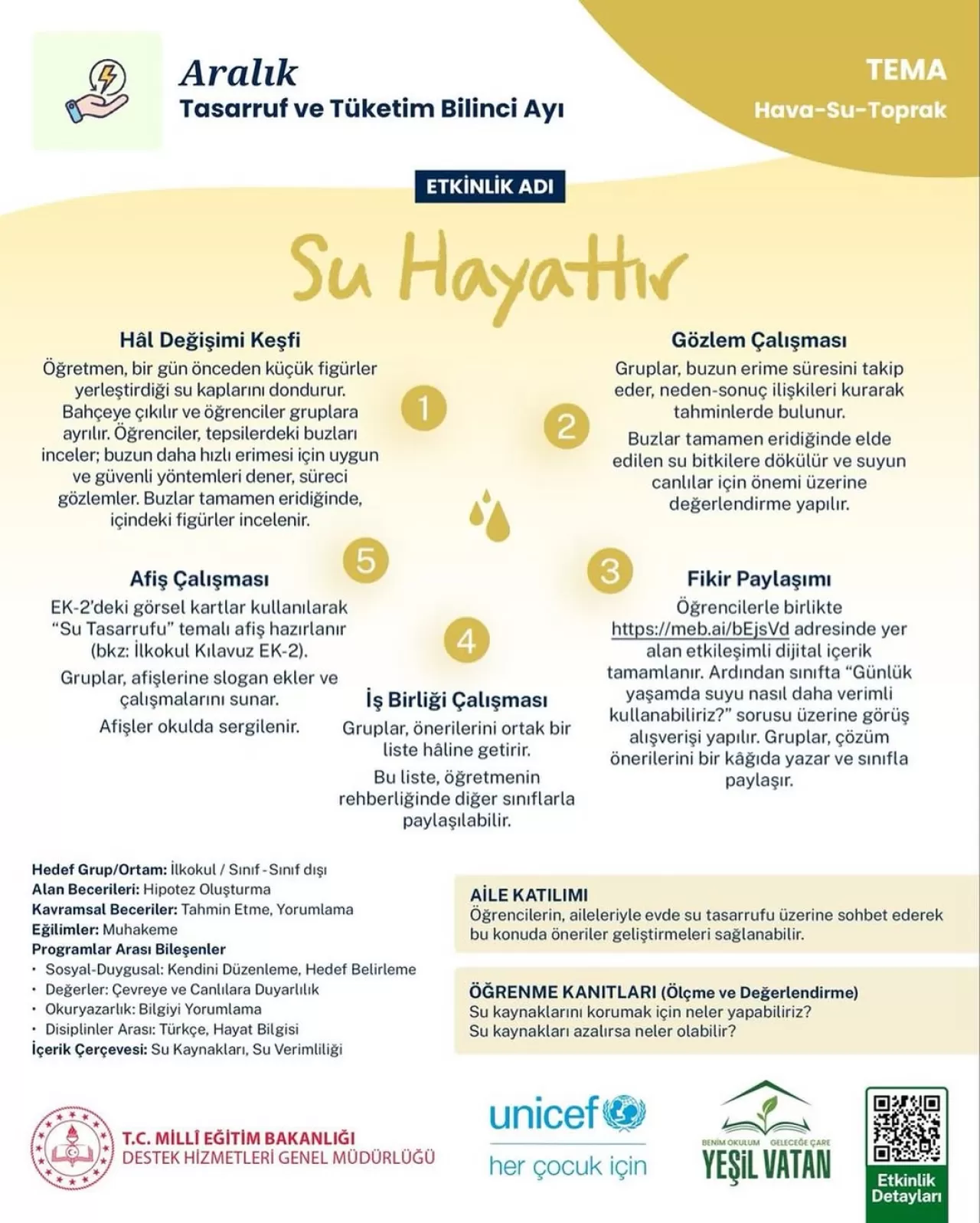 Programın son aşamasında öğrenciler, "Su Tasarrufu" temalı afişler hazırlıyor. Bu yaratıcı çalışmayla çocuklar, öğrendiklerini görsel bir mesaja dönüştürerek farkındalığı yaygınlaştırıyor. Etkinliğin detaylarına ve "ÇARE Çevre ve İklim Okuryazarlığı Etkinlikleri Öğretmen Kılavuzu"ndaki diğer içeriklere çevrimiçi olarak ulaşılabiliyor.