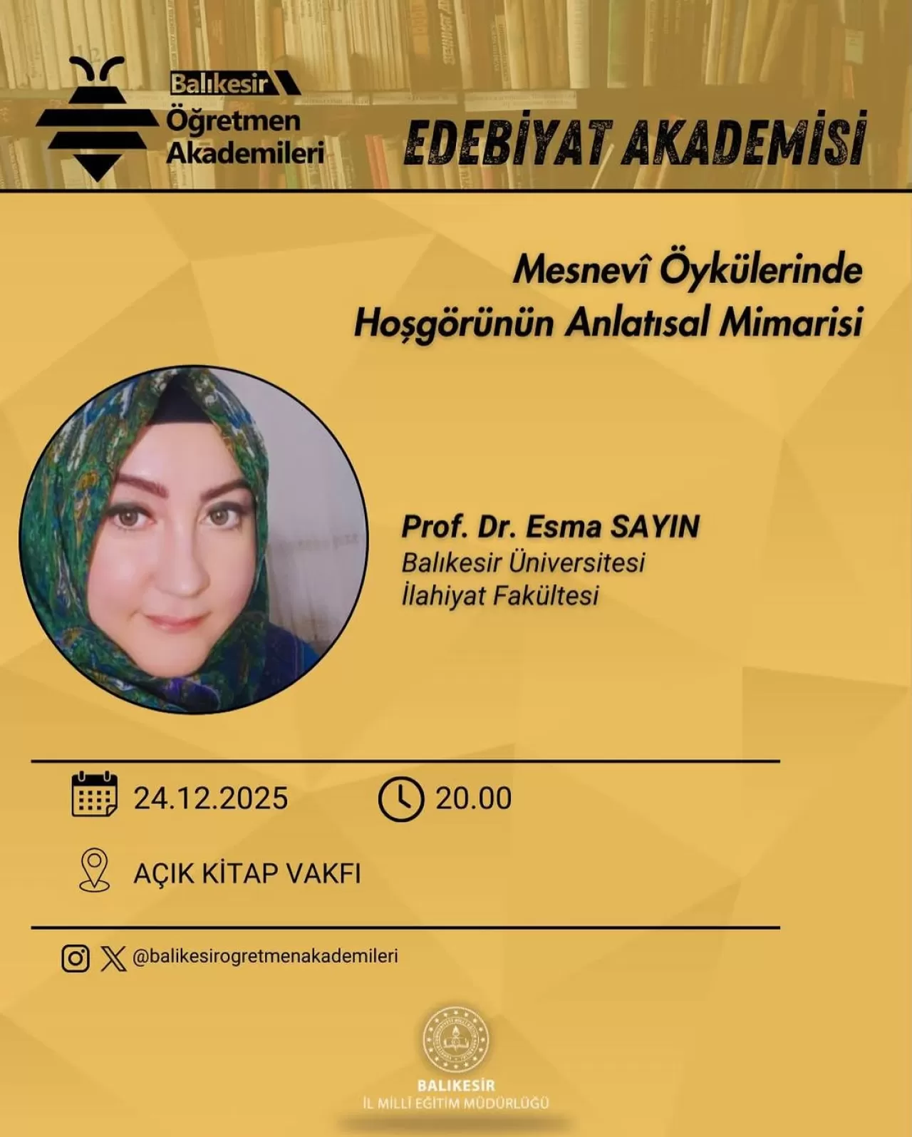 Balıkesir Öğretmen Akademileri kapsamında düzenlenen Edebiyat Akademisi'nin üçüncü oturumu gerçekleşti. Oturumun konusu "Mesnevi Öykülerinde Hoşgörünün Anlatısal Mimarisi" olarak belirlendi.