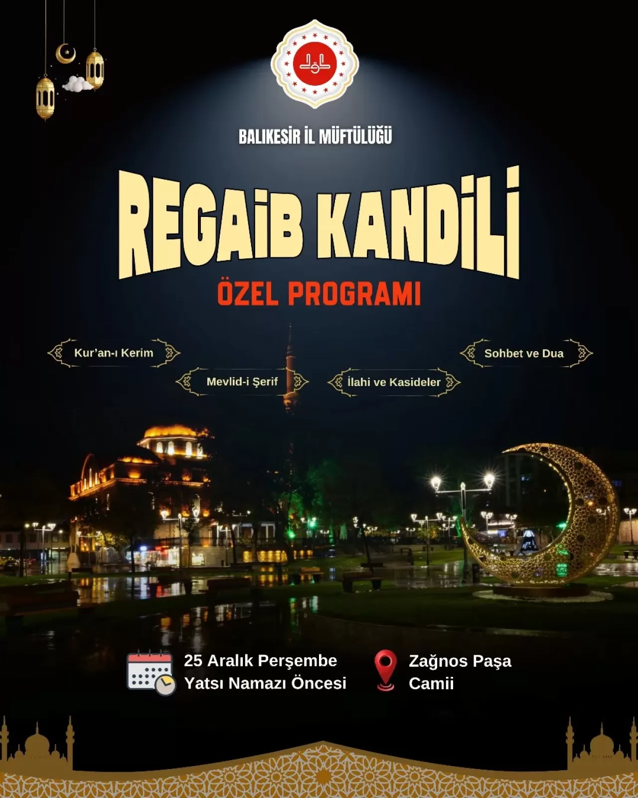 Balıkesir İl Müftülüğü, mübarek Regaib Kandili'ne özel bir program düzenliyor. Kandil gecesi, şehrin manevi atmosferine katkı sağlamak amacıyla Zağnos Paşa Camii'nde gerçekleştirilecek.