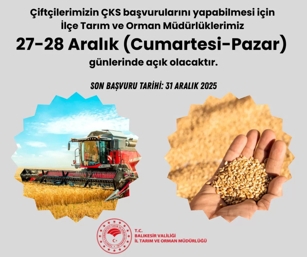 Tüm çiftçiler, ÇKS işlemlerini tamamlamak için cumartesi ve pazar günleri de Balıkesir'e bağlı ilçelerde bulunan Tarım ve Orman Müdürlükleri'ne başvurabilecek. Bu uygulama ile çiftçilere daha esnek bir başvuru zamanı sunulmuş olacak.